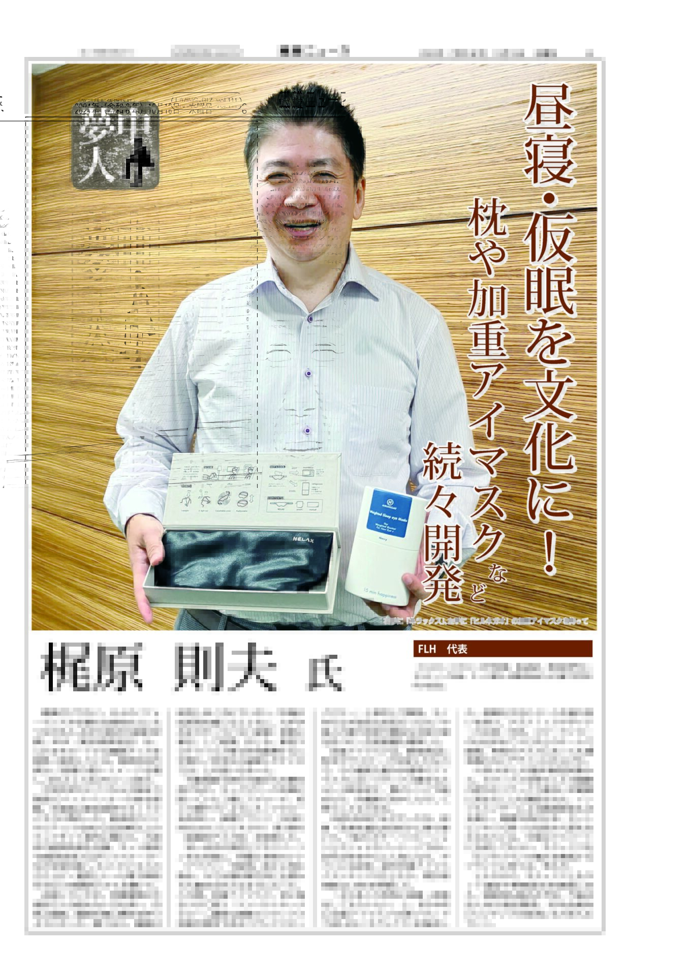 『繊維ニュース』の紙面に弊社代表が取材を受けました 2025 10/15 プレスリリース 2024年10月18日2025年10月15日 繊維ニュースに弊社代表・梶原が取材を受けました。 昼寝や仮眠を文化にする活動や、新ブランド『NELAX』の開発背景について語っています。 詳細は繊維ニュース10月16日付け紙面をご覧ください。 プレスリリース URLをコピーしました! 【東京ギフトショー】ハコスコさんとコラボ! 『朝日新聞』に加重アイマスクが掲載されました